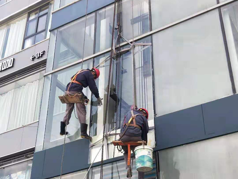 • 小田園電梯外幕墻玻璃更換施工現(xiàn)場照。